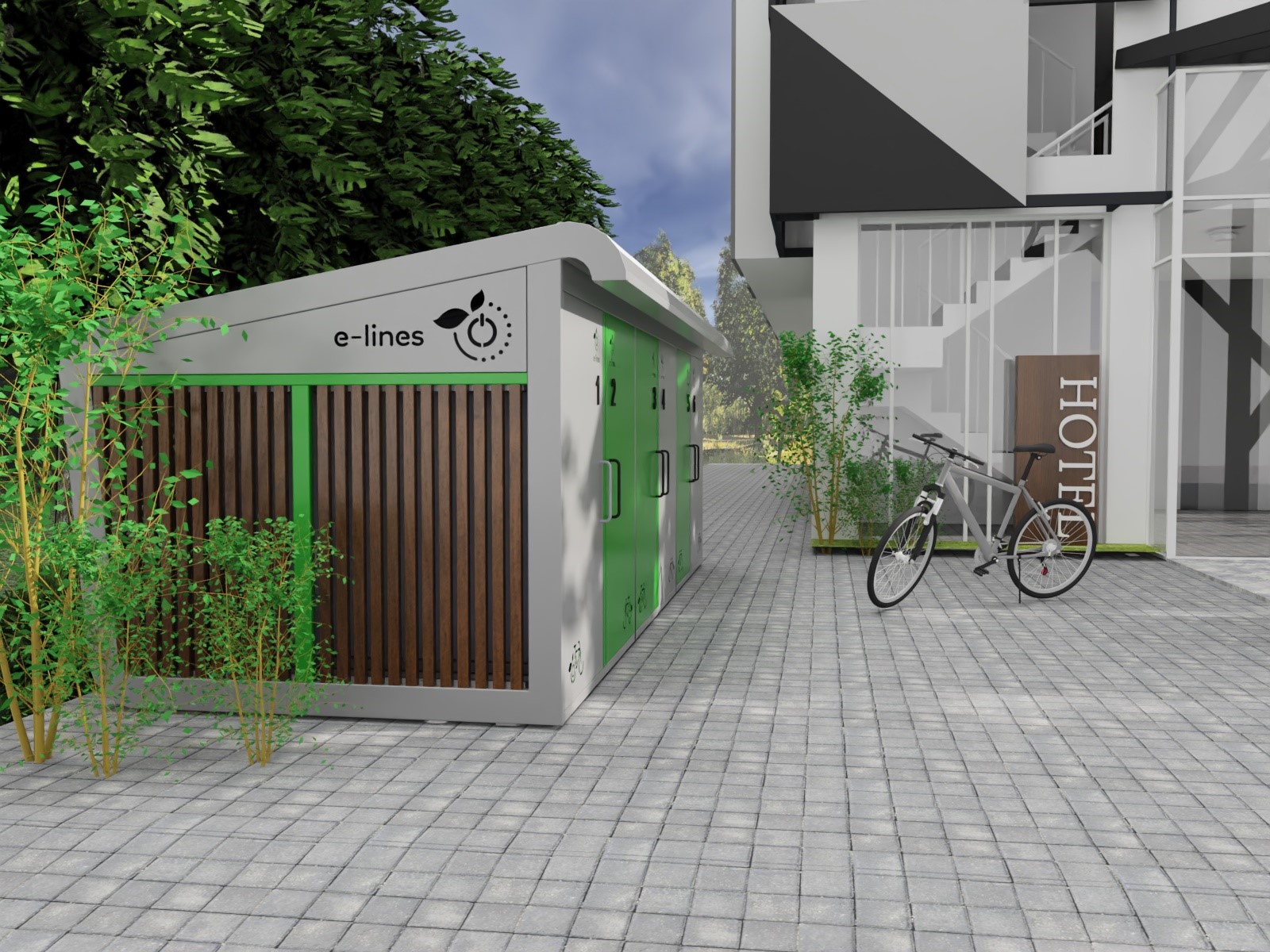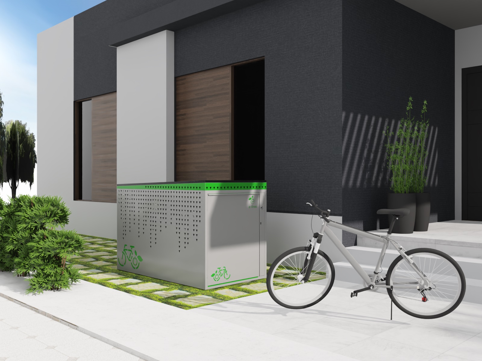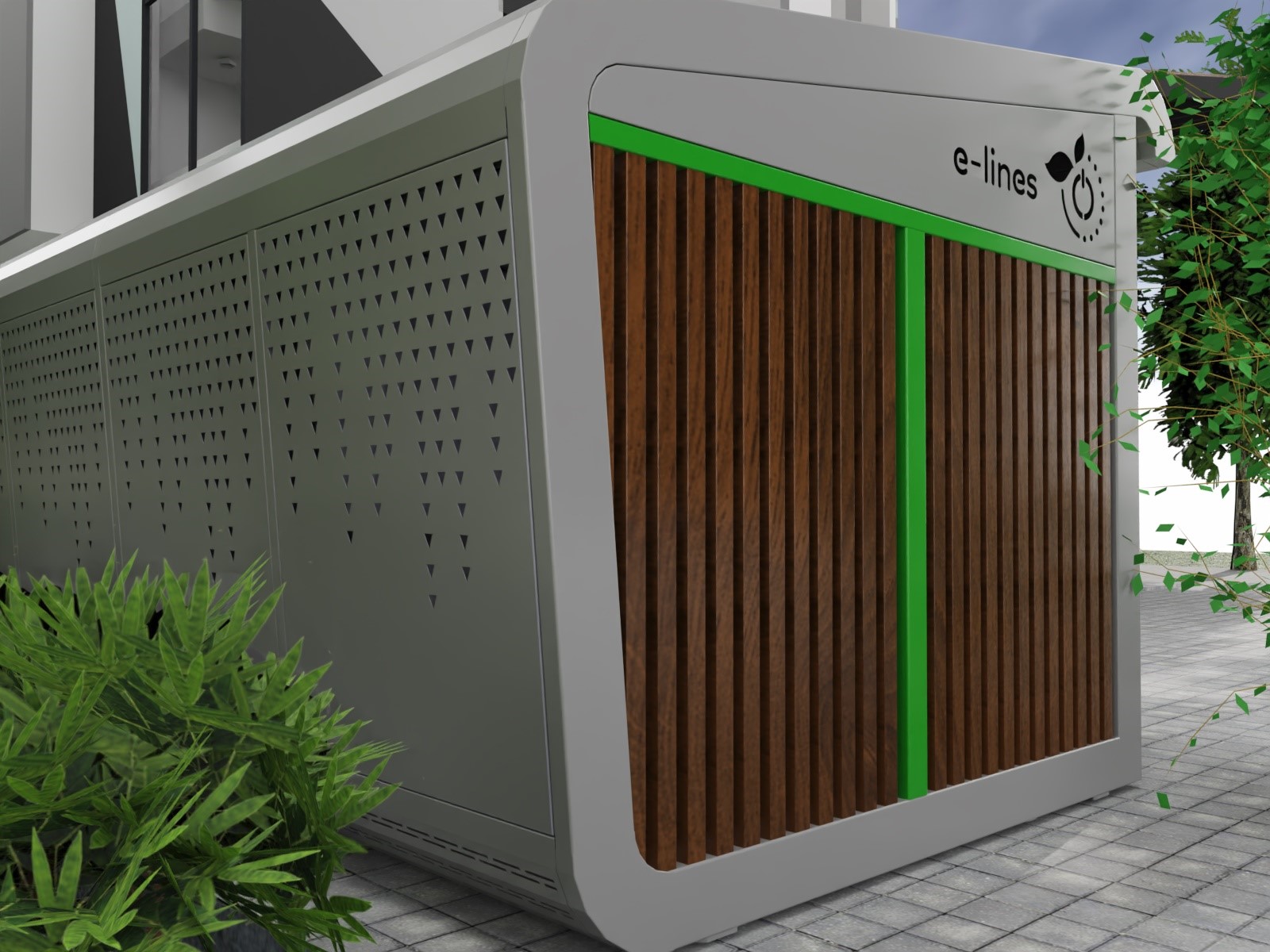 BikeBox to bezpieczny garaż na rower elektryczny, który naładuje akumulator Twojego roweru, eliminując ryzyko pożaru w domu. Chroni także Twój rower przed kradzieżą i trudnymi warunkami atmosferycznymi, a dzięki instalacji fotowoltaicznej działa niezależnie od sieci energetycznej. Nasza aplikacja e-lines brain steruje dostępem do garażu, nadzoruje ładowane baterii oraz robi zdjęcie po każdym zamknięciu drzwi.