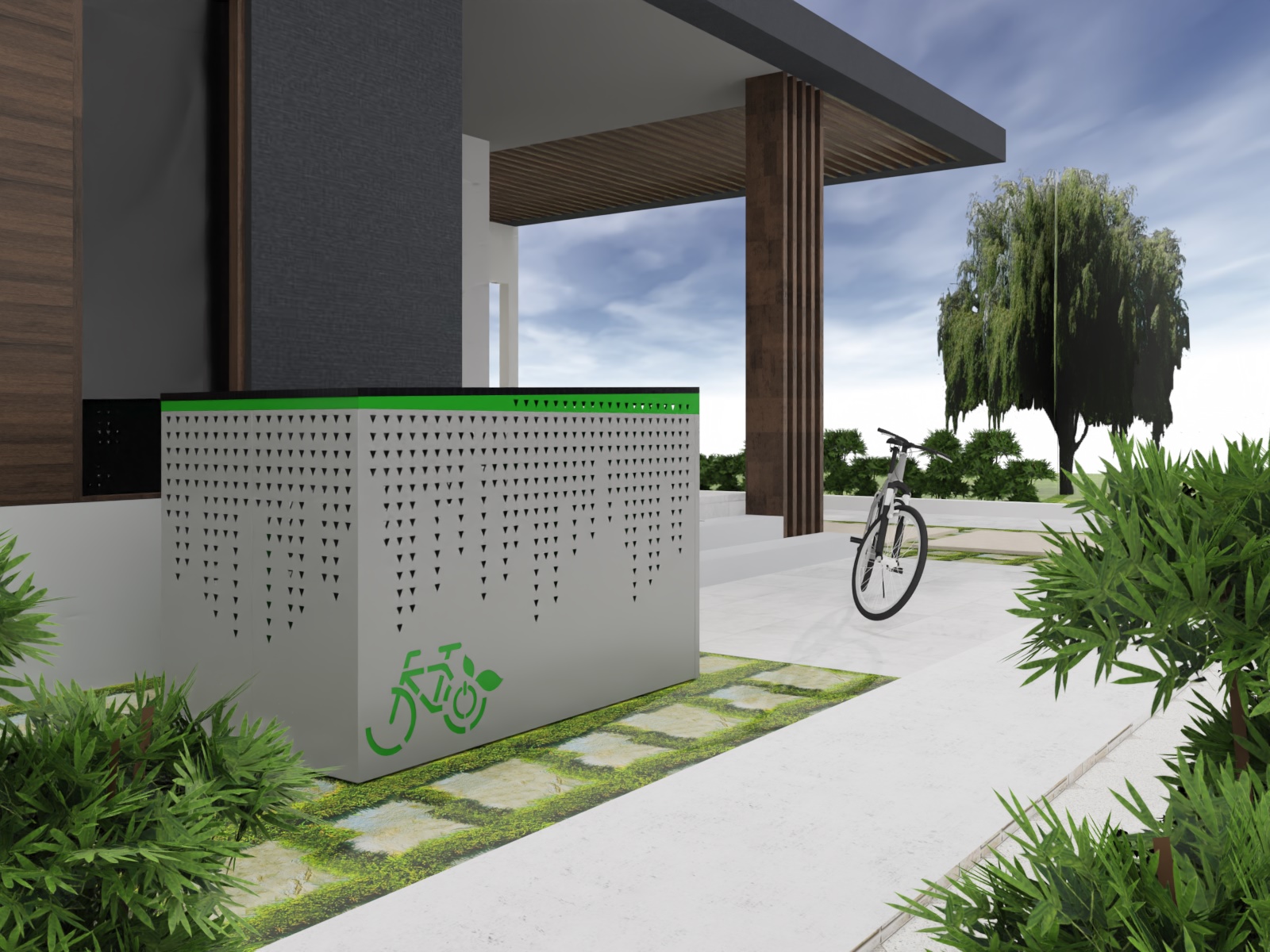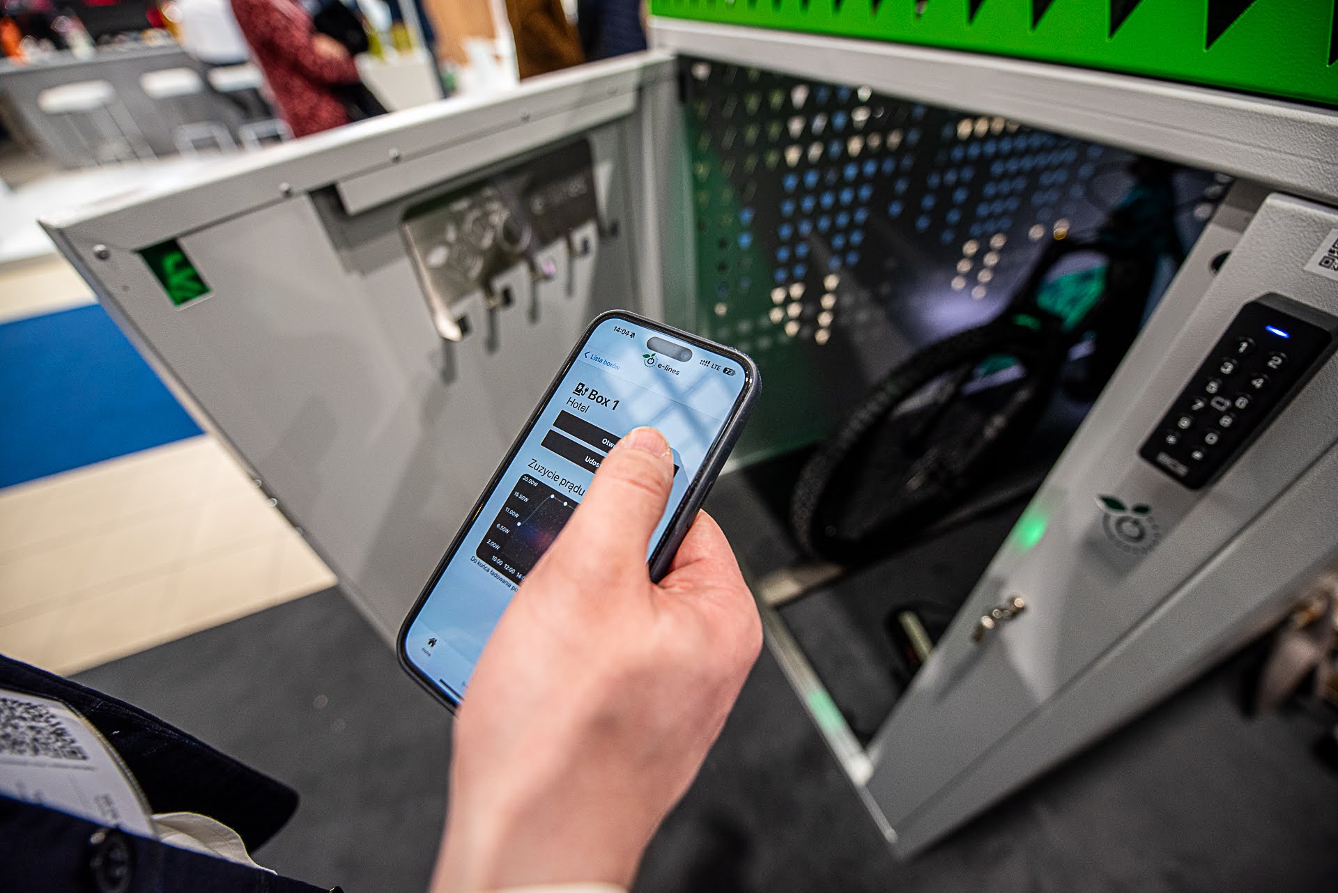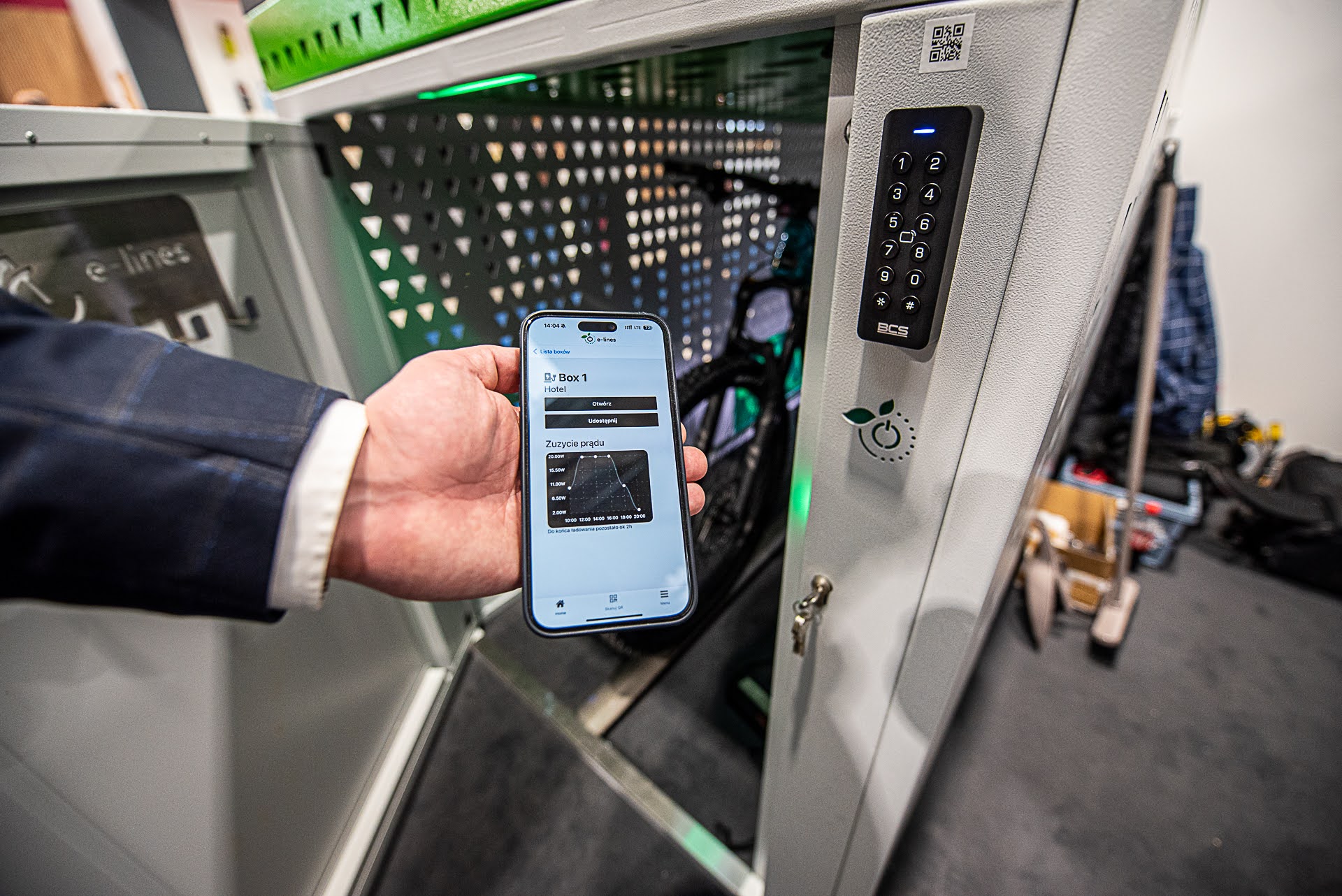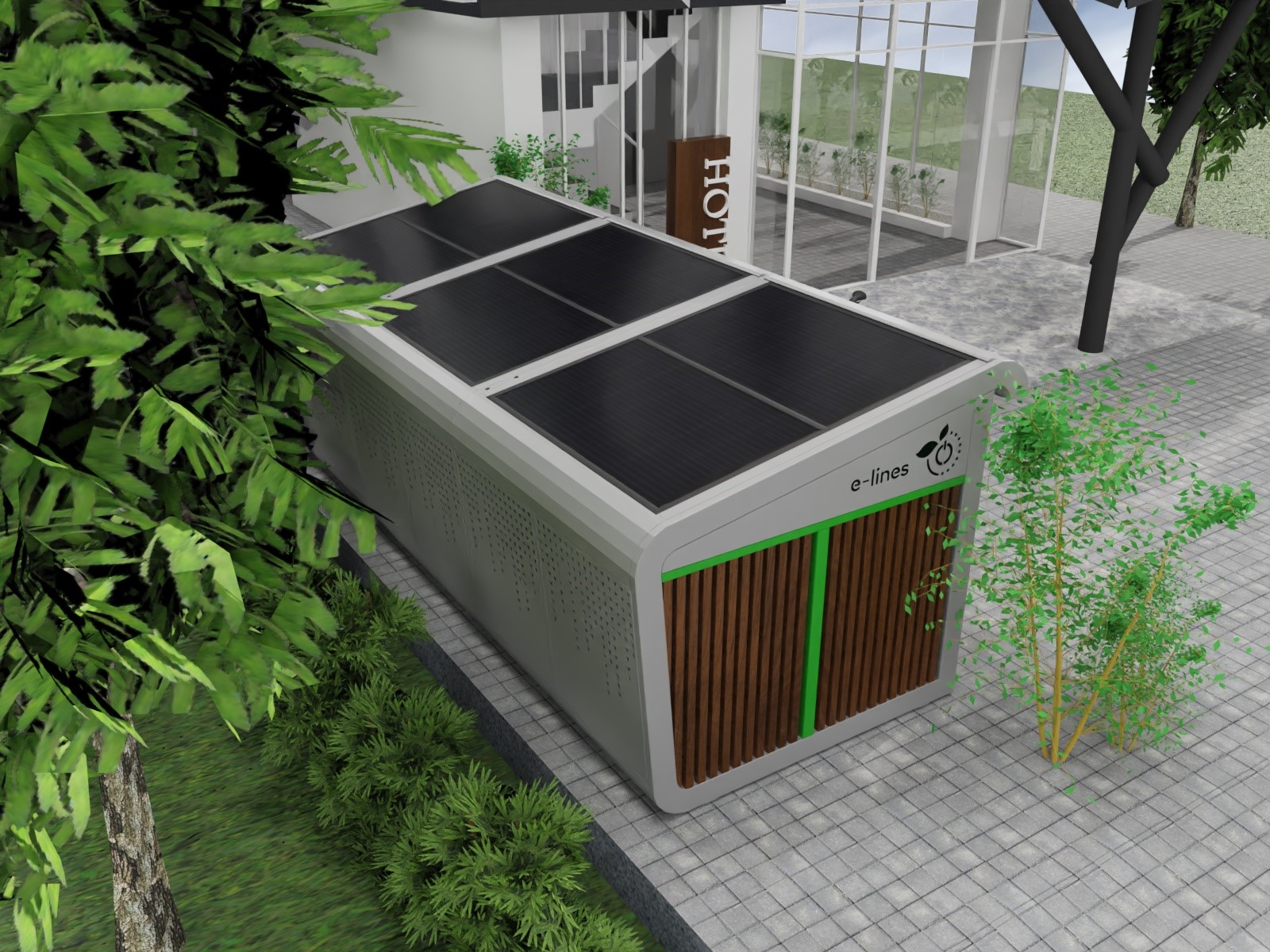 BikeBox to bezpieczny garaż na rower elektryczny, który naładuje akumulator Twojego roweru, eliminując ryzyko pożaru w domu. Chroni także Twój rower przed kradzieżą i trudnymi warunkami atmosferycznymi, a dzięki instalacji fotowoltaicznej działa niezależnie od sieci energetycznej. Nasza aplikacja e-lines brain steruje dostępem do garażu, nadzoruje ładowane baterii oraz robi zdjęcie po każdym zamknięciu drzwi.