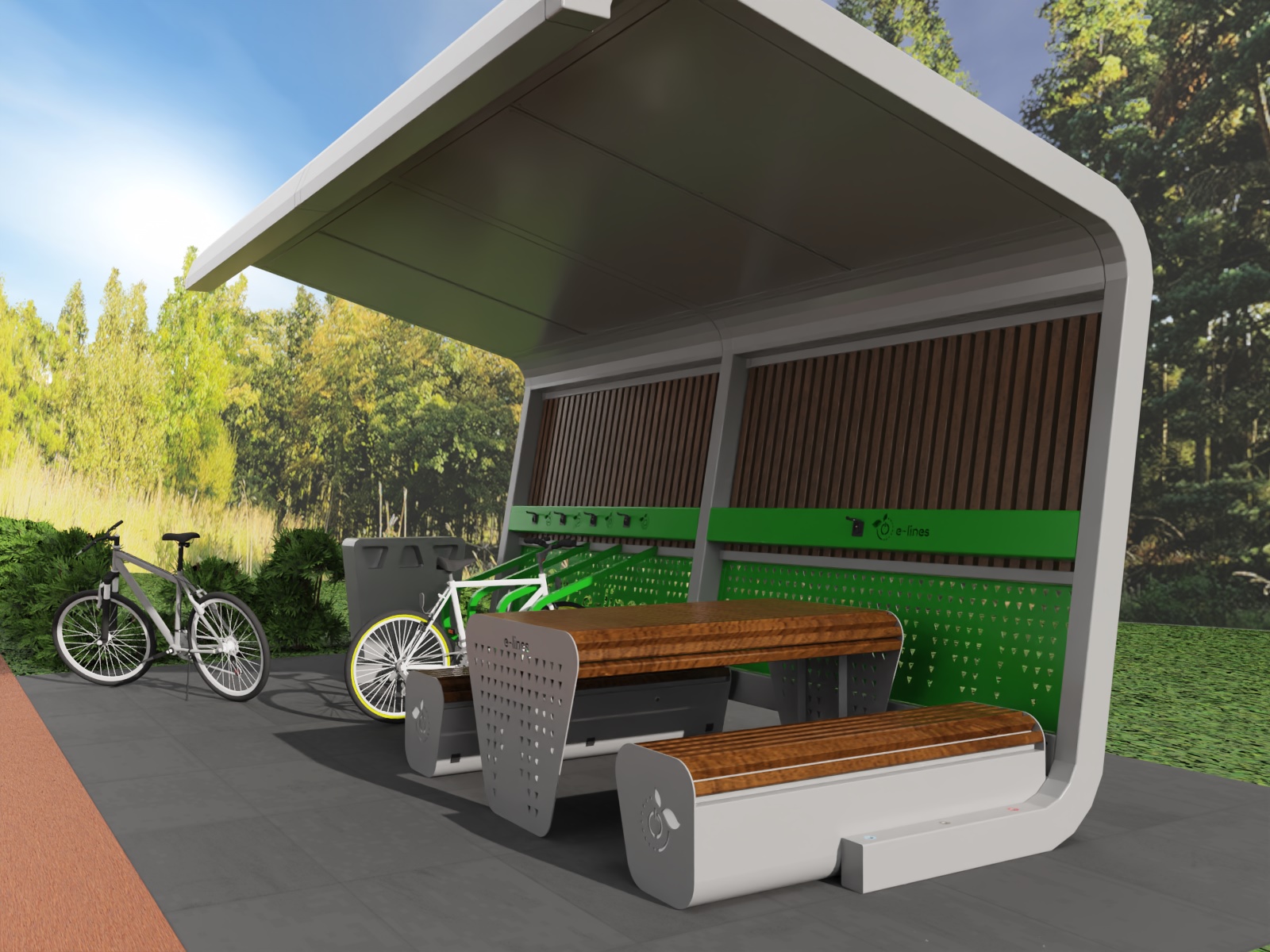 BikeBench to nowoczesna solarna ławka z gniazdem sieciowym 230V i gniazdem USB, przy której naładujesz akumulator roweru lub laptopa w czasie przerwy podczas wycieczki. BikeBench, dzięki panelom fotowoltaicznym, może być instalowana w dowolnym nasłonecznionym miejscu. Nasza aplikacja e-lines brain steruje dostępem do obu gniazd i nadzoruje ładowane baterii.