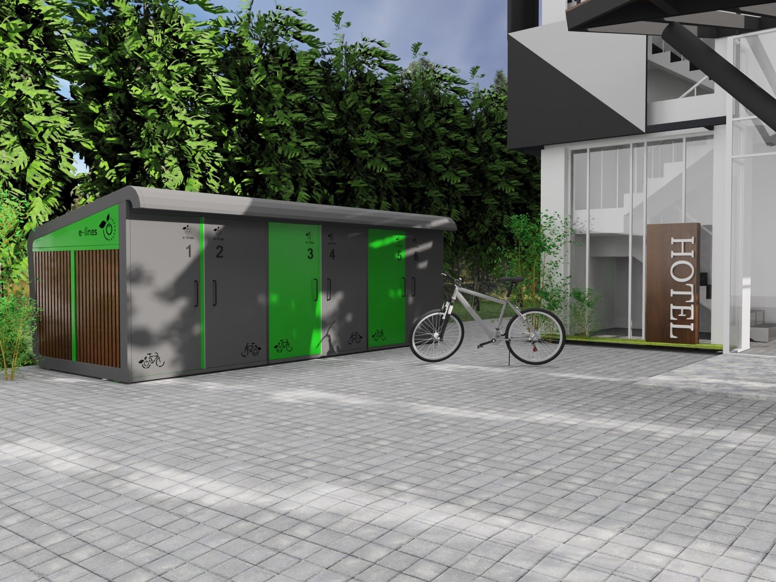 BikeGarage to 6-stanowiskowy garaż na rowery elektryczne z funkcją ładowania z instalacji fotowoltaicznej, stworzony z myślą o deweloperach, hotelach i miejscach użyteczności publicznej. Sprawdzi się w bezobsługowych wypożyczalniach, zapewniając indywidualny dostęp do każdego boxu za pomocą aplikacji. BikeGarage zwiększa komfort, eliminując potrzebę zabierania roweru do mieszkania/biura.
